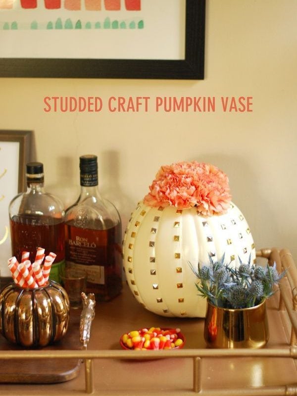 It’s beginning to feel a lot like fall in North Carolina! The weather has started to cool down, the AC is off and the windows are open. To get ready for fall, I made a few seasonal changes to my bar cart. One of my favorite additions is a DIY studded craft pumpkin vase. Keep on reading to learn how to make your own pumpkin vase!